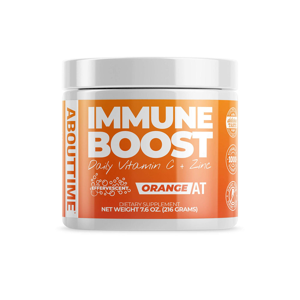 Immune Support Dairy Free About Time Immune Boost, Daily Vitamin C and Zinc Effervescent Powder provides you with a deliciously fizzy and citrus burst of essential nutrients featuring 1000mg of Vitamin C to support your daily immunity. Each serving provides more Vitamin C than 10 oranges. About Time Immune Boost is a powder that dissolves quickly in water.